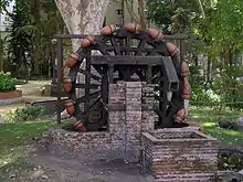 Una noria es un instrumento que se emplea en los huertos para la elevación del agua de pozos poco profundos,[1] principalmente en sitios bajos y hondos, siguiendo el principio del rosario hidráulico. El movimiento se consigue generalmente utilizando tracción animal, aunque tanto en castellano como en sus acepciones en otras lenguas derivadas del mismo, también puede referirse a las norias movidas por una corriente de agua.[2] La noria más grande existente, es de las que usan la fuerza motriz de un curso de agua, tiene unos 20 m de altura y está en la ciudad de Hama en Siria.[3][4]