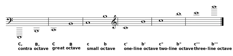 Este diagrama muestra ejemplos de la nota más grave y más aguda de cada octava, dando su nombre en el sistema de Helmholtz (con letras y primas), y en el método alemán de nomenclatura de octavas. (La octava por debajo de la contraoctava se conoce como sub-contra octave, ‘subcontraoctava’).