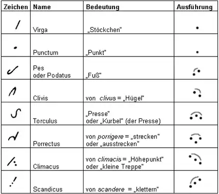 - Utiliza el custos, símbolo que se coloca al final de un sistema[5] y cuya función es anticipar y facilitar al cantor la altura que sigue a continuación.