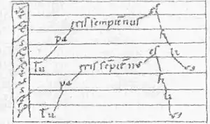 Los signos notacionales entonces fueron colocados en el extremo izquierdo del pentagrama (de forma similar a la colocación de la clave actual), y algunos ejemplos se complementan con “T” y “S” entre los signos para aclarar la colocación de los semitonos.[4] Las sílabas de las palabras habladas eran escritas entonces en las líneas del pentagrama (véase ejemplo arriba). Si cambiaba el tono, las sílabas de la palabra se movían a una línea superior o inferior del pentagrama. Este procedimiento fue utilizado para escribir el estilo organum a dos, a tres y a cuatro voces.[2]