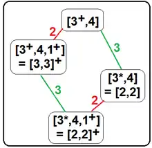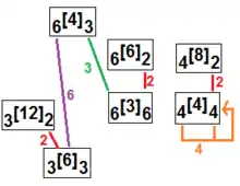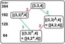 Los operadores + también se pueden aplicar dentro de los corchetes, como [X,Y+] o [X,(Y,Z)+], con lo que se crean subgrupos "semidirectos" que pueden incluir generadores de reflexión y no de reflexión. Los subgrupos semidirectos solo se pueden aplicar a los subgrupos de grupos de Coxeter que tienen ramas de orden pares adyacentes. A los elementos entre paréntesis dentro de un grupo de Coxeter se les puede dar un operador de superíndice +, que tiene el efecto de dividir las ramas ordenadas adyacentes en medio orden, por lo que generalmente solo se aplica con números pares. Por ejemplo, [4,3+] y [4,(3,3)+] (![]()