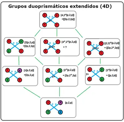 Los grupos de rango cuatro también definen algunos de los grupos del papel pintado bidimensionales, como casos límite de los grupos de duoprismas de cuatro dimensiones: