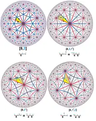 para el grupo triangular (p q r). Si los órdenes de ramificación son iguales, se pueden agrupar como un exponente según la duración del ciclo entre paréntesis, como [(3,3,3,3)] = [3[4]], que representa el diagrama de Coxeter ![]()