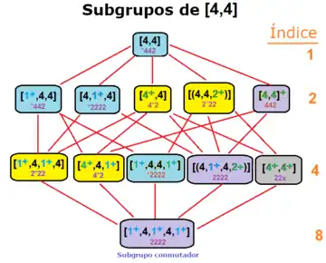 Para la familia infinita p[4]2, para cualquier p= 2, 3, 4,..., hay dos subgrupos: p[4]2 → [p], índice p, while y p[4]2 → p[ ]×p[ ], índice 2.