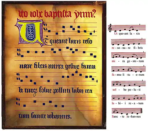 Posteriormente, se añade una línea para señalar la tónica y una indicación inicial que refería el modo. Finalmente, Guido D'Arezzo elaboró un sistema silábico de representación del tono a partir del himno de las vísperas de la fiesta de San Juan Bautista organizando lo que serían más tarde los nombres de las notas musicales: