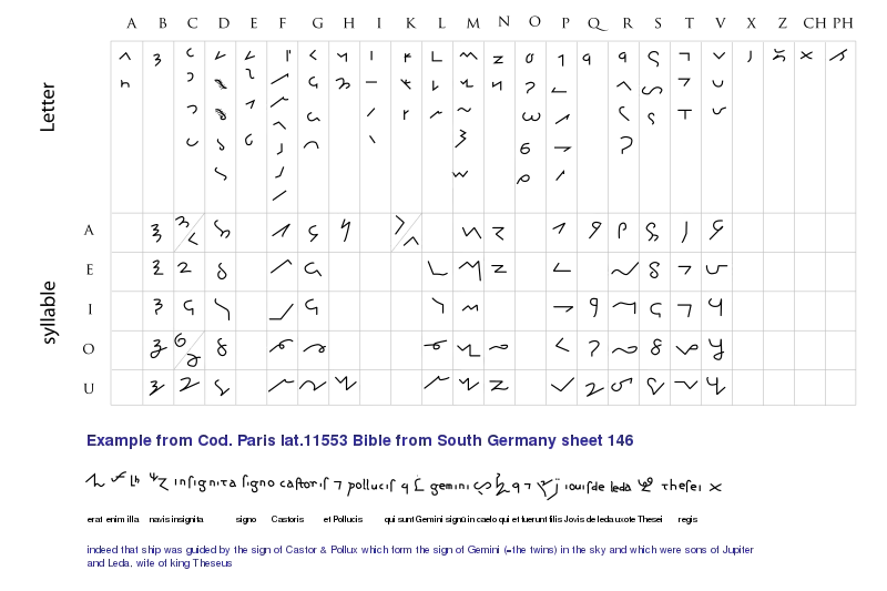 Alfabeto tironiano con una línea de ejemplo en que se mezclan letras normales y notas tironianas.