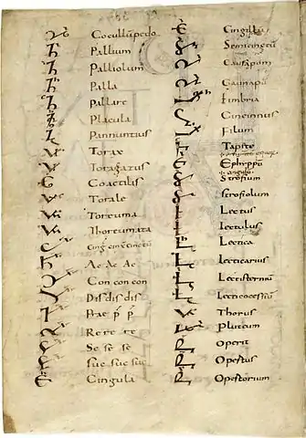 Primera página de los Commentarii notarum tironianarum (800-850), con dos columnas que detallan la correspondencia entre las notas tironianas (izq.) y su significado (der.).