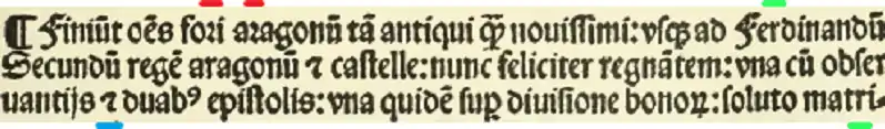 Página impresa en Zaragoza, en 1496. En rojo, r rotunda; en verde, r normal, en azul, et tironiano.