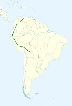 Esta golondrina es nativa de los Andes de Bolivia, Colombia, Ecuador, Perú y Venezuela.[1] Generalmente se encuentra en las laderas orientales de los Andes, pero se registra en ambas vertientes en los Andes centrales. Normalmente se encuentra entre los 2600 y los 3300 m s. n. m. en Ecuador, no baja de los 2000 m s. n. m. en Perú y los 2300 m s. n. m. en Bolivia, y no sobrepasa por encima los 3500 m s. n. m. ni Perú ni en Bolivia. En Venezuela, presentan menos variación de altitud, y allí suelen encontase entre los 2200 y los 2400 m s. n. m. El límite inferior donde han sido avistadas en Venezuela son los 1550 m s. n. m. A veces, el mal tiempo puede empujarlas a altitudes inferiores.