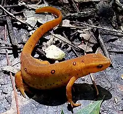 La tritón del este, también conocido como tritón americano de lunares rojos, tritón verde americano, tritón del este americano (Notophthalmus viridescens), es una especie de caudado o salamandra de la familia de los salamándridos. Se distribuye por Norteamérica.