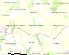 - Situación de Notre-Dame-du-Hamel en un mapa de Francia y de comunas limítrofes (en francés)