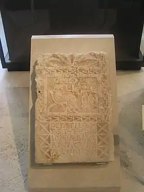 ![]() Inscripción funeraria romana procedente de Covarrubias (Burgos), localidad cuyo término perteneció en la época romana al Municipium Nova Augusta y que es una buena muestra del taller epigráfico que funcionó en este municipio.