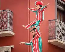 El casco especial es un element incorporado en 2008 para garantirzar la seguridad del niño que remata las figures de cuatro niveles o más.[3]
