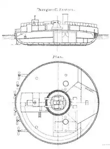 Botado el 21 de mayo de 1873, el acorazado Almirante Novgorod fue diseñado por el almirante Andrey Alexandrovich Popov, con el propósito de crear una plataforma armada y acorazada estable, con un par de cañones pesados, que pudiese operar en aguas costeras. En teoría, la ventaja de un casco circular era que una pequeña nave podría llevar el mismo armamento que otra mayor de una forma más ordinaria. Su peso máximo era de 2 671 t. El armamento principal del Almirante Novgorod eran dos cañones de 11 pulgadas y 26 t, montados sobre sendos afustes giratorios independientes. El barco montaba un total de seis motores a vapor, que funcionaban cada uno para un eje propulsor. La caldera y la sala de máquinas ocupaban la mitad del espacio interior. Las calderas estaban situadas en dos compartimentos separados, uno para cada chimenea. Solía llevar en cubierta cuatro botes salvavidas a vapor.