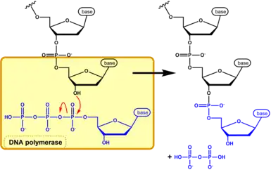 La síntesis de ácidos nucleicos es catalizada por ADN polimerasa o ARN polimerasa para la síntesis de ADN y ARN respectivamente.[16] Estas enzimas unen covalentemente el grupo -OH libre en el carbono 3 'de una cadena de nucleótidos en crecimiento al α-fosfato en el carbono 5' del siguiente (d) NTP, liberando los grupos β- y γ-fosfato como pirofosfato (PPi).[17] Esto da como resultado un enlace fosfodiéster entre los dos (d) NTP. La liberación de PPi proporciona la energía necesaria para que se produzca la reacción. Es importante señalar que la síntesis de ácidos nucleicos se produce exclusivamente en la dirección 5 'a 3'.