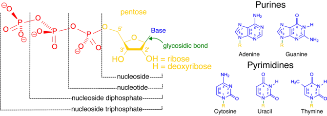 El término nucleósido se refiere a una base nitrogenada unida a un azúcar de 5 carbonos (ya sea ribosa o desoxirribosa).[1] Los nucleótidos son nucleósidos unidos covalentemente a uno o más grupos fosfato.[9] Para proporcionar información sobre el número de fosfatos, los nucleótidos pueden denominarse nucleósidos (mono, di o tri) fosfatos.[10] Por tanto, los nucleósidos trifosfatos son un tipo de nucleótido.