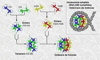 Los nucleosomas se organizan como cuentas de un collar, las cuales, a su vez, se pliegan sobre sí mismas repetidas veces hasta conformar un cromosoma.[3] Cada célula humana contiene 30 millones de nucleosomas aproximadamente.[4] Las histonas son proteínas ricas en aminoácidos básicos y altamente conservadas a través de la escala filogenética.[5]