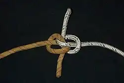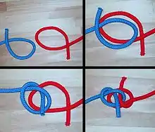- Pase cada uno de los extremos libres alrededor del lazo en la otra cuerda, y luego por el "túnel" creado por las dos cuerdas.