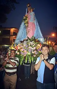El presbítero Juan Esteban Rodríguez de Lamas, quien al conocer la próxima creación de la parroquia eclesiástica de Naguanagua, propone como patrona a María Madre de Dios, bajo la advocación de Nuestra Señora de Begoña, a la vez que donó la imagen de Begoña que él veneraba en el oratorio de su hacienda, siendo él mismo quien institucionalizó sus fiestas mediante escritura de obligación notariada de fecha 6 de marzo de 1783. Se cree que desde el 15 de agosto de 1804, fecha en la cual la construcción de la iglesia llegó a su final, la imagen descansa en el santuario, que lleva el mismo nombre.[4]