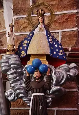 Junto al lado frontal de la nube, está una estatua de San Francisco de Asís, en la que el Patriarca aparece de rodillas y sosteniendo con ambas manos tres mundos que se apoyan sobre su cabeza y simbolizan las tres órdenes que fundó: