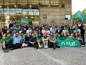 Las elecciones FEUC 2023 fue el primer evento eleccionario presencial en la Universidad desde el estallido social y la pandemia de COVID-19; estas elecciones fueron realizadas los días 25 y 26 de octubre. Para esta oportunidad, la presidencia de la lista federación del movimiento fue presidida por Sabina Orellana, estudiante de derecho y actuación, además de ser coordinadora general de la NAU y coordinadora general de la FEUC 2021;[55] de igual forma la carta a Consejería Superior también provenía de la base de derecho del movimiento, siendo Camila Rojas, más conocida por su sobrenombre "Caminsky".[56] El resultado de la NAU en este proceso eleccionario fue histórico para el movimiento verde, ganando en primera vuelta tanto la Federación de Estudiantes como la Consejería Superior con un 50.63% y un 57.75% respectivamente, esto después que el presidente del TRICEL Sebastián Arancibia ratificara los datos después de un reconteo por parte del órgano excrutador universitario.[57][58][59][60][61] También se logró un récord en consejerías territoriales al conseguir 17.[62][57] Este escenario político-electoral resultó en un desplome y crisis el Movimiento Gremial debido al mal resultado conseguido (dos consejerías territoriales y el último lugar tanto en elección FEUC como CS).[63]