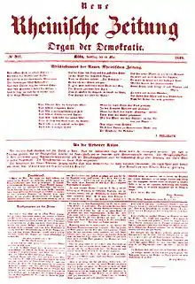 La Nueva Gaceta Renana, que pronto alcanzó los seis mil abonados, dio cabida a representantes de todas las fuerzas progresistas pues Marx consideró que la prioridad entonces era reforzar el movimiento democrático —el diario llevaba el subtítulo «órgano de la democracia»— mediante la alianza entre la clase obrera y la burguesía liberal para acabar definitivamente con el Antiguo Régimen en Alemania. Así en sus páginas escribieron además del propio Marx y de Engels, Wilhelm Wolff, Ernst Dronke, Georg Weerth o Ferdinand Freiligrath.[2] Sobre la cuestión de la alianza de la clase obrera con el resto de fuerzas progresistas Marx escribió en un artículo:[3]