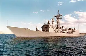 • 1 lanzador Mk 13 mod 4 de un raíl para 32 misiles AA GDC Pomona Standard SM-1MR y 8 misiles antibuque RGM-84 Harpoon • 1 cañón Oto Melara 76 mm/62 Mk75 • 1 CIWS FABA Meroka Mod 2A3 20 mm/120 • 2 tubos triples Mk 32 de 324 mm para torpedos antisubmarinos Mk 46 mod 5 o Mk 50 • 2 ametralladoras Browning M2 de 12,7 mm | |