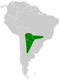 Se distribuye por el centro sur y sureste de Bolivia (Cochabamba, Chuquisaca, Santa Cruz) y centro sur de Brasil (oeste de Mato Grosso do Sul) hacia el sur hasta el centro y oeste de Paraguay y noroeste de Argentina (al sur hasta Córdoba).[4]