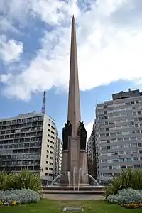 Este obelisco de 40 metros de altura se realizó enteramente en granito rosado uruguayo. En su cara oeste, la aguja central tiene grabada la inscripción A los constituyentes de 1830. Incluye tres estatuas de bronce que representan a la Ley, la Fuerza y la Libertad. Tiene una fuente de agua hexagonal alrededor. En el borde oeste de la fuente están grabados los nombres de las instituciones bancarias que ofrendaron su homenaje a los constituyentes de 1830.[1]