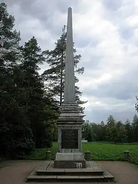 La inscripción en el pedestal dice: «En recuerdo de la victoria en el río Kagul en Moldavia, 21 de julio de 1770, bajo el mando del conde Piotr Rumyántsev».