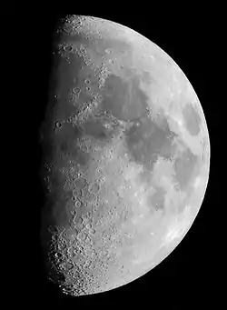 - Los mares : son las manchas oscuras sobre la superficie del astro, rastros de impactos de meteoritos gigantescos que han tenido lugar hace millones de años. Representan la sustancia basáltica de inmensos cráteres. De diferente composición y más oscura que el resto de la superficie, esta roca, por su extensión, da la impresión desde la Tierra de ver mares sobre la superficie del satélite, lo que ha dado su nombre a estas manchas. Los mapas lunares disponibles en numerosas tiendas especializadas permiten localizarlos y nombrarlos.