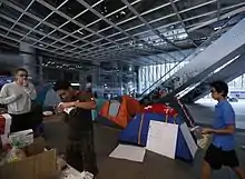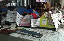 Haciendo eco del movimiento Occupy contra la codicia corporativa y la desigualdad económica, la campaña ¨Occupy Central¨ de Hong Kong comenzó el 15 de octubre de 2011, con manifestantes ocupando la plaza debajo de la sede de HSBC en Central, un símbolo emblemático del distrito comercial del territorio.[1][2] La plaza es propiedad del banco, pero fue escriturada durante la construcción en 1983 como un área dedicada a servir como paso peatonal público.[3] El campamento de Hong Kong, con el objetivo de crear una comunidad ideal que aboga por la "igualdad",[4] atrajo a una comuna de ocupantes que incluía estudiantes, jóvenes profesionales, activistas, desempleados y personas sin hogar.[5] Al 11 de diciembre de 2011 y agosto de 2012, había alrededor de 20 y 10 campistas respectivamente,[2] pero más de 200 participantes participaron en la campaña en su apogeo.[4]