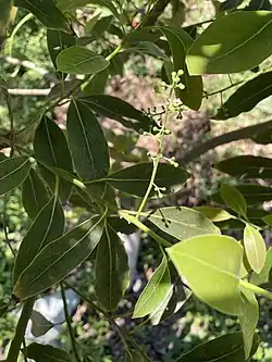 Es un árbol dioico (fuste masculino y femenino), de 15 m de altura, tronco negruzco, recto, corteza persistente, inerme. Follaje persistente, verdoso oscuro brillante. Hojas simples, lanceoladas, de 6-11 cm de largo, glabras, haz brillante. Flores blanquecinas, diminutas, en panojas axilares o subterminales. Florece en primavera y en verano. Fruto drupaceo negruzco.