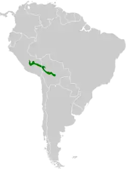 Vive en la selva húmeda de los Andes del sur del Perú y oeste de Bolivia.[3] Mide unos 27 cm y pesa alrededor de 325 g.