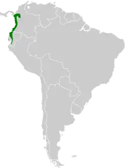 Es nativa de Colombia y Ecuador. Habita en bosques tropicales de tierras bajas.