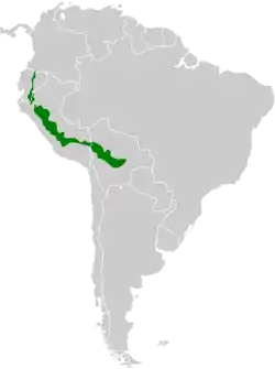 Se lo encuentra en Bolivia, Ecuador, y Perú. Vive principalmente en las laderas orientales de los Andes, entre los 800 a 2000 m s. n. m., y en el lado del Perú, sobrepasa esa altitud. Su hábitat natural son los bosques montanos húmedos subtropicales o tropicales.