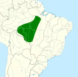 Se encuentra en el Brasil central (desde el sur del Río Amazonas, en el este de Amazonas y Pará, hacia el sur hasta el este de Rondônia y centro de Mato Grosso) y este de Bolivia (noreste de Santa Cruz).