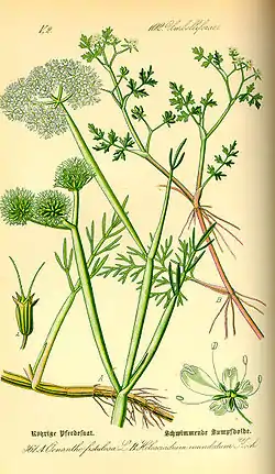 Oenanthe: nombre genérico que deriva del griego oinos = "vino", para una planta de olor a vino, y el nombre griego antiguo para alguna planta espinosa.[3]
