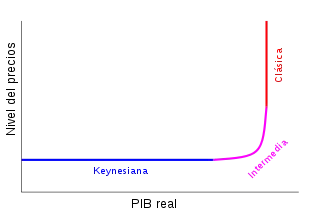 Esto lleva a la curva de oferta agregada a volverse vertical, llegando al modelo opuesto al keynesiano; el modelo clásico o de pleno empleo de los factores productivos, donde solamente un shock positivo en la oferta agregada, como por ejemplo, una disminución en los costos de sus materias primas, mejoras en la tecnología, y otras variables, pueden hacer que ésta se desplace a su derecha, con el fin de poder producir más allá del PIB potencial y por ende poder aumentar el nivel de renta de la economía.