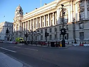 Ubicado en la confluencia de Horse Guards Avenue con Whitehall, su estilo arquitectónico está basado en el Neo-Barroco. El edificio tiene 1000 habitaciones repartidas en 7 pisos y comunicadas entre sí con 3200 m de pasillos. Su construcción llevó 5 años y costó 1,2 millones £. Su forma es un tanto extraña asemejándose a un trapecio, esto fue debido a que el edificio se construyó adaptándose a la forma del terreno para maximizar su espacio. Sus cuatro cúpulas características fueron diseñadas como elementos decorativos para disimular su forma.