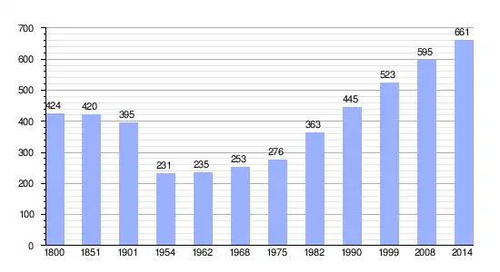 Los datos demográficos contemplados en este gráfico de la comuna de Oingt[4] se han cogido de 1800 a 1999 de la página francesa EHESS/Cassini, y los demás datos de la página del INSEE.[5]