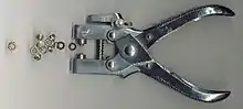 Hay también remachadoras profesionales (como se muestra en la imagen), aunque por lo general golpeando con un martillo contra la matriz-horma es perfectamente efectivo para pequeños proyectos. Los usos más comunes incluyen el reforzar los agujeros de cordones de botas, zapatos, corsés y otras prendas de vestir, así como cortinas y otros artículos del hogar que requieren ganchos para colgarlas, por ejemplo, las cortinas de ducha en las barras tensoras de soporte.[4]