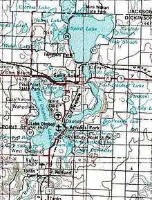 La región de los Grandes Lagos de Iowa, mostrando el Lago Spirit (parte superior), el Lago West Okoboji (a la izquierda), y el Lago East Okoboji (a la derecha); mapa de la USGS