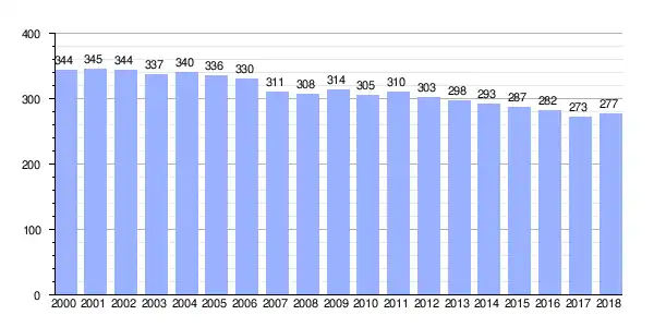 Gráfica de evolución demográfica de Olas[2] entre 2000 y 2018