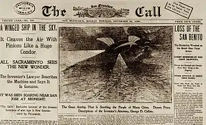 - El Sacramento Bee y el San Francisco Call reportaron el primer avistamiento el 18 de noviembre de 1896.[5] Los testigos informaron de una luz que se movía lentamente sobre Sacramento en la tarde del 17 de noviembre con una elevación estimada de 1000 pies.[5] Algunos testigos dijeron que podían ver una forma oscura detrás de la luz.[5] Un testigo llamado R. L. Lowery divulgó que oyó una voz de la nave ordenando aumentar la elevación con el fin de evitar golpear una torre de la iglesia.[5] Lowery agregó, “en lo que sin duda significó un guiño al lector”, que creía que el aparente capitán se refería a la torre de una cervecería local, ya que no había iglesias cercanas.[5] Lowery describió más adelante la nave como siendo accionada por dos hombres esforzándose sobre pedales de bicicleta. Por encima de los hombres pedaleando parecía haber un compartimiento de pasajeros, que se encontraba bajo el cuerpo principal del dirigible. Una luz estaba montada en el extremo delantero de la aeronave.[5] Algunos testigos reportaron el sonido del canto mientras la nave pasaba por encima.[5]