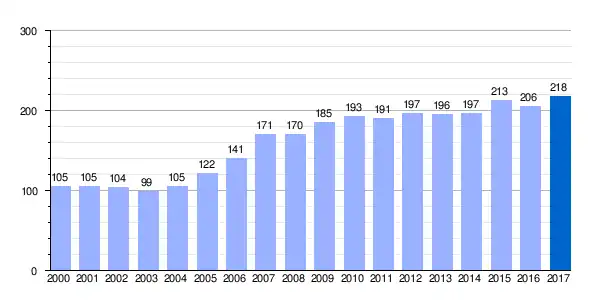 | Gráfica de evolución demográfica de Ollávarre[9] entre 2000 y 2017 |