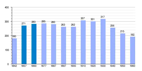 | Gráfica de evolución demográfica de Olmillos[5] entre 1842 y 1960 |