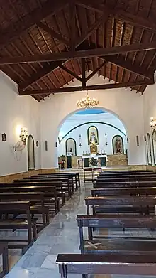 El templo es de una sola nave, separada de la capilla mayor por un arco. Esta posee una cúpula —que tiene una pequeña ventana— con cuatro nervios, que arranca sobre una cornisa estrecha y circular, sostenida en las cuatro esquinas por unas pechinas. La iglesia cuenta con una sacristía situada al lado izquierdo de la nave cuyo acceso se encuentra en la capilla mayor. El techo es de artesonado de madera con refuerzos de metal mientras que el de la cúpula es de piedra. El edificio está cubierto por un tejado de tejas árabes a dos aguas y el de la cúpula a cuatro aguas.