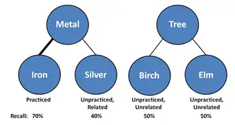 Un subconjunto de los ítems se evalúa mediante una prueba de rellenar espacios en blanco. Para un ítem determinado, se muestra al participante el nombre de la categoría y las dos primeras letras de una palabra estudiada de esa categoría (por ejemplo, METAL-hi______). Los participantes deben rellenar el espacio en blanco con una palabra adecuada de esa categoría. Normalmente, los participantes practican el recuerdo de los ítems varias veces.[1][11] La fase de recuperación-práctica divide los ítems en tres tipos diferentes que son de interés durante la prueba final, y que a menudo se denotan utilizando la siguiente notación:[1]