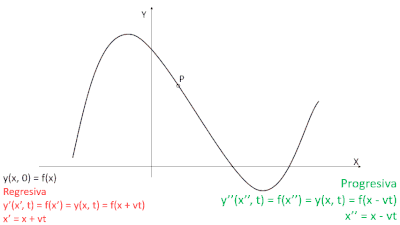 Representa la superposición de una onda propagándose en sentido positivo del eje , (, alejándose del origen con velocidad hacia la derecha, la onda progresiva, y otra onda propagándose hacia la izquierda, en sentido negativo del eje , , también con velocidad , la onda regresiva. Basta cambiar el sentido de la velocidad por en el argumento de la onda para cambiar el sentido de propagación de la onda y una onda que se propagaba hacia la derecha con argumento , se propague hacia la izquierda con argumento .